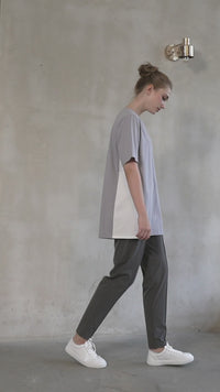 ルーパ(loopa)の23SS(2023年春夏)新作ヨガウェア、「コンビ VネックTee( CombiV-neckT )」は半袖のヨガトップスです。体型をカバーする長めのロング丈でホットヨガ、フィットネス、スポーツウェアとしておしゃれに着こなせます。吸水速乾・消臭・接触冷感とトレーニングで汗をかいても安心の高機能素材を使用。 ゆったりと着られるオーバーサイズのカットソー。バイカラーで細見え効果があり、デイリーにも活躍するレディースTシャツです。